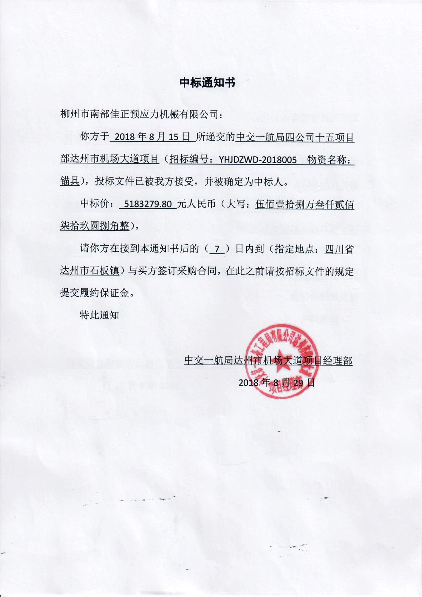 中交一航局達(dá)州機(jī)場(chǎng)中標(biāo)通知書