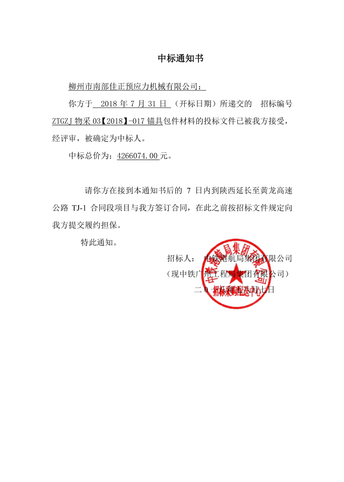 中鐵港航局三公司黃延中標(biāo)通知